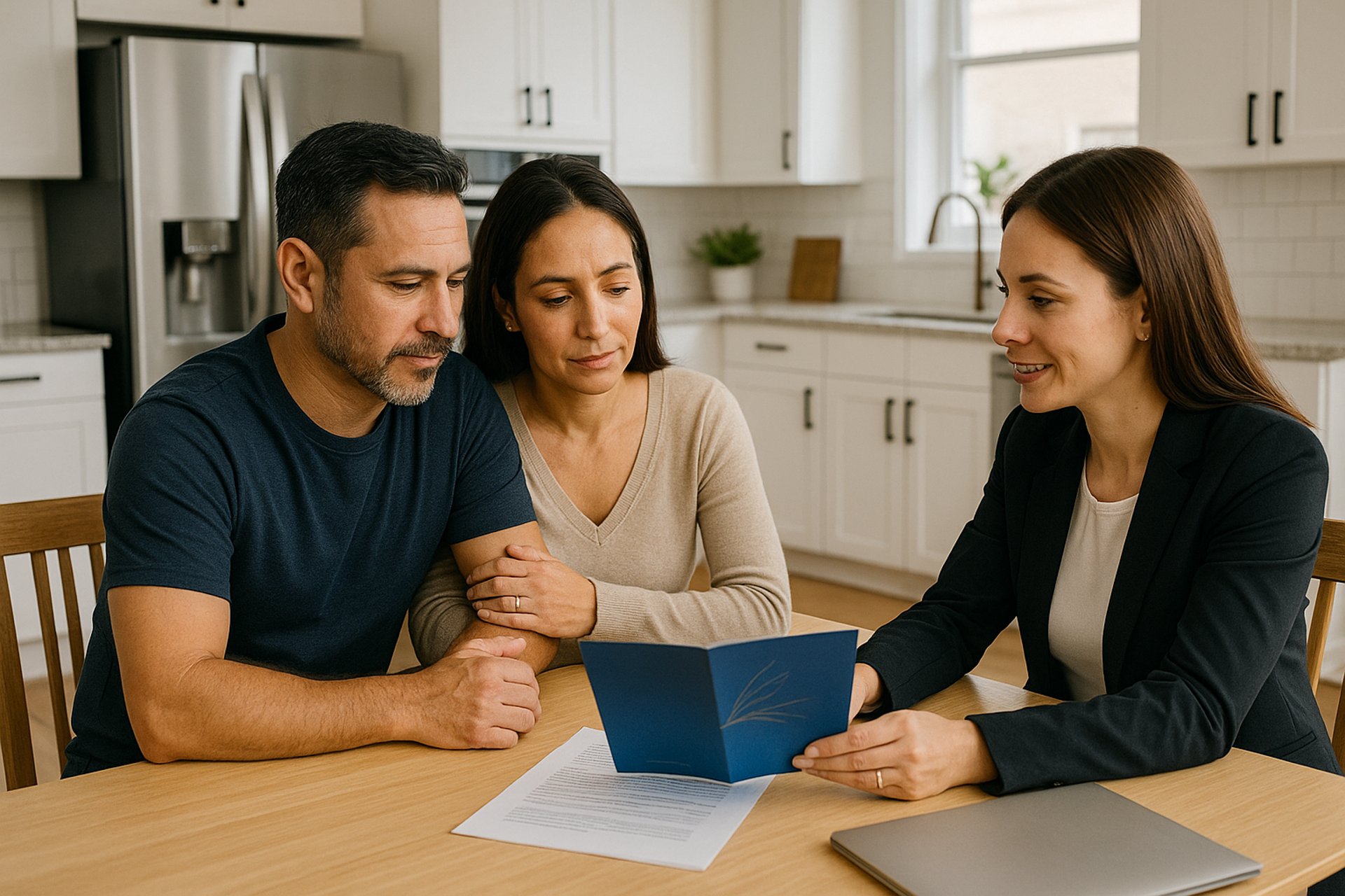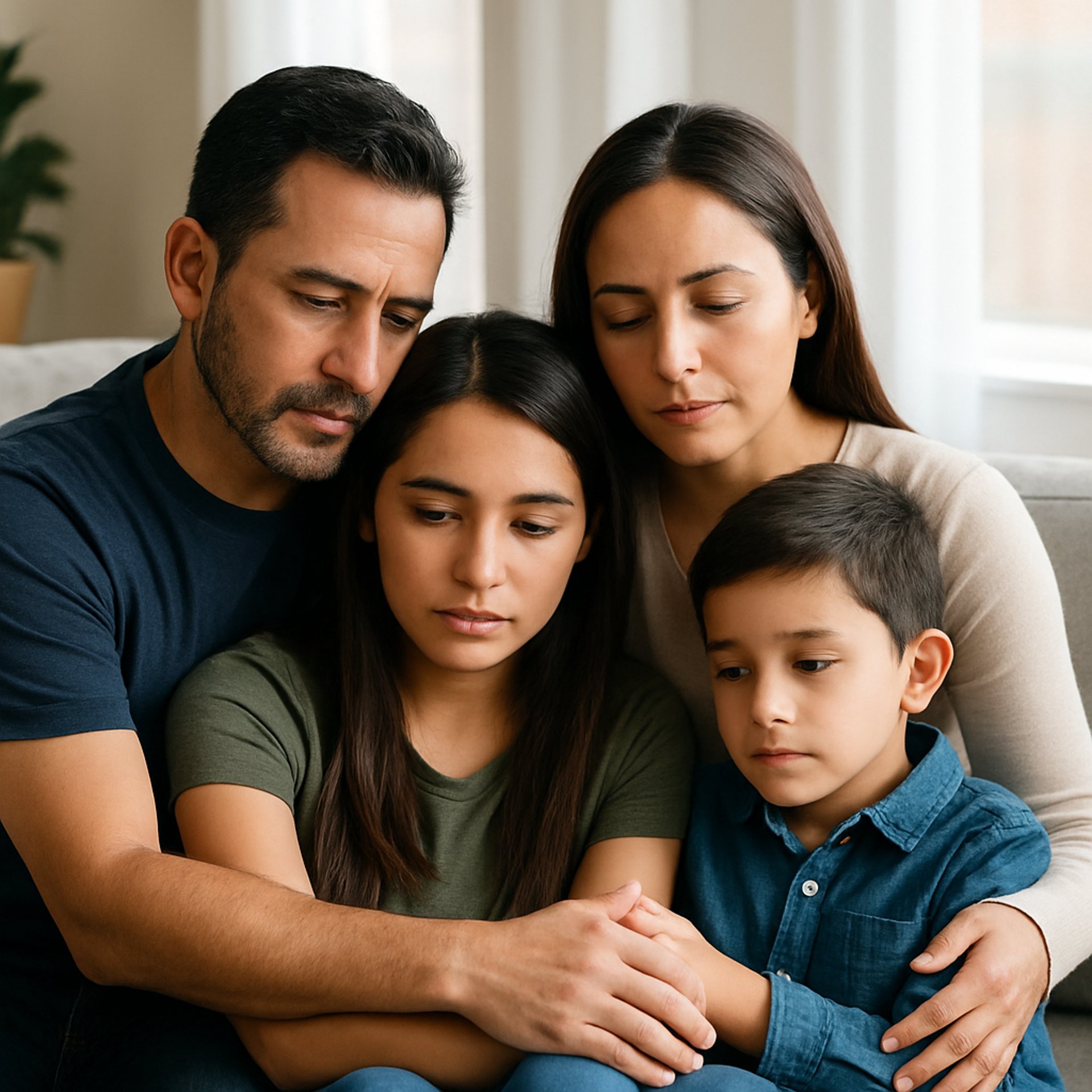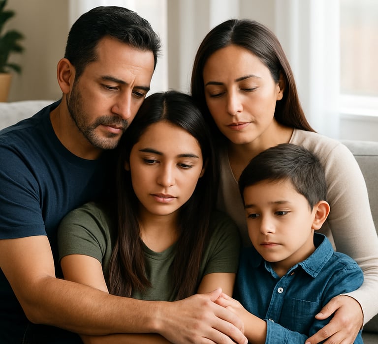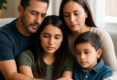 A caring Hispanic family sitting together, discussing funeral pre-planning with a compassionate advisor.